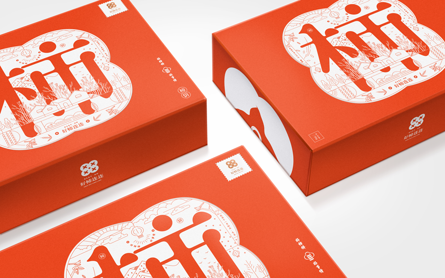 為了契合好柿餅好事情的產品理念,我們在設計上,力求營造這一品牌氣質,同樣的吸收原料篩選的嚴謹苛刻,注重品質感和形態(tài)視覺美學的精雕細琢,為了保證純正天然的視覺感受,包裝整體以柿子天然色作為主體色,在其正面,以柿子的剪影作為整個包裝的視覺中心,圍繞其我們創(chuàng)作了優(yōu)美線條感的圖形,描述了柿餅形成的兩大節(jié)氣過程-霜降和冬至,簡潔的線條概括了好柿餅的升華過程,在畫面的最中心是富平生態(tài)農家田園風的生態(tài)景觀,底部是富平石川河的描述,簡潔凝練的線條,營造出了富有詩意的品牌氣質,同時講述了好柿連連的品牌故事。在包裝的標識部分,我們運用了郵票的形式,意在強調產品的獨一無二,私人定制性和專屬性,最好的產品屬于追求最好的你,將最好的柿餅送寄給你,為你帶了好事情好運氣。