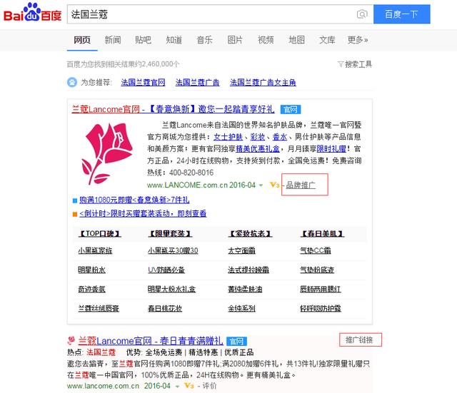 塑造品牌當然離不開企業(yè)網(wǎng)站了,自己的網(wǎng)站毫無疑問是要排名在第一位的,如今企業(yè)都會利用百度品牌推廣和百度競價推廣來包裝品牌,比如百度搜索法國蘭蔻,如圖: